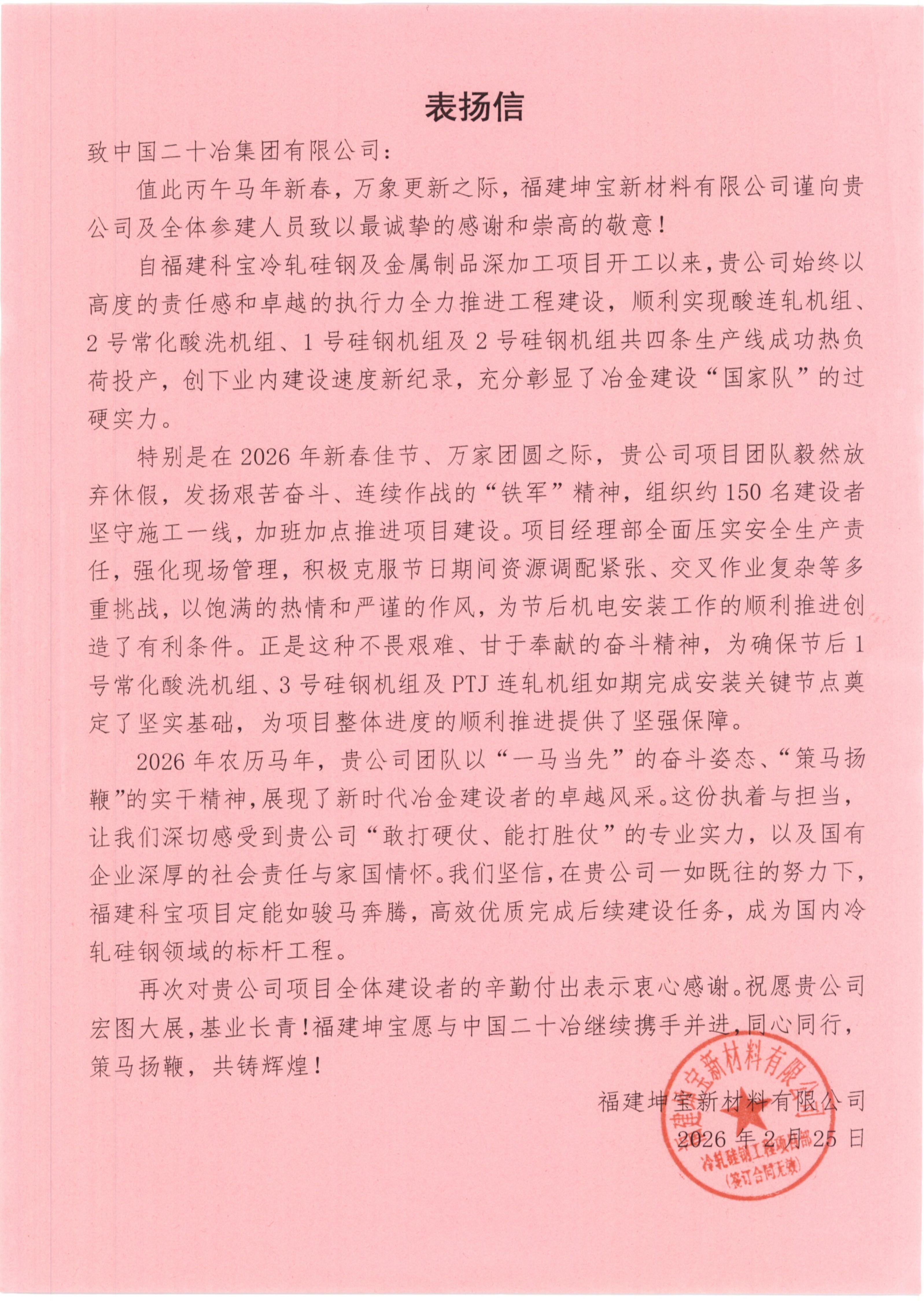 3月5日,由冶金工业公司承建的福建科宝冷轧硅钢及金属制品深加工项目收到业主福建坤宝新材料有限公司发来的表扬信,对项目团队在工程建设中的卓越表现和春节期间的坚守奉献表示衷心感谢和崇高敬意。