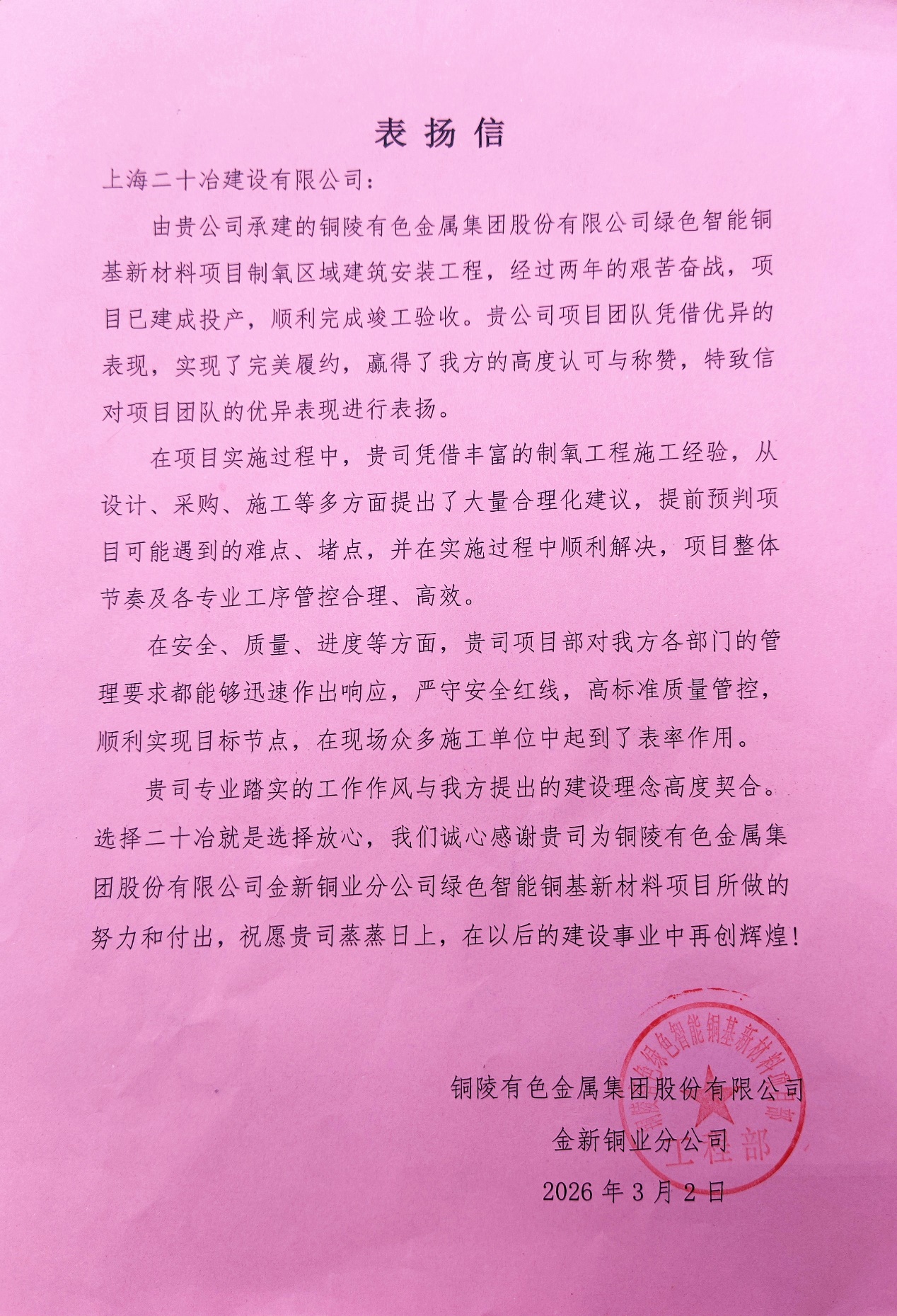 3月5日,上海尊龙凯时人生就是搏承建的铜陵有色绿色智能铜基新材料项目制氧工程收到业主的表扬信。